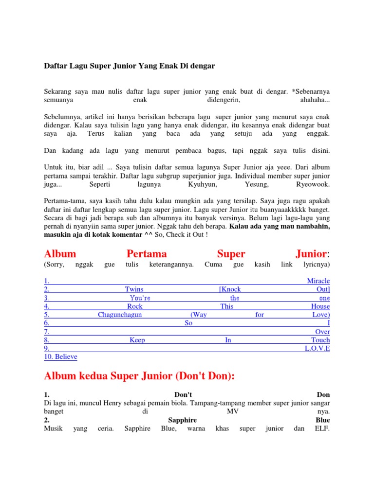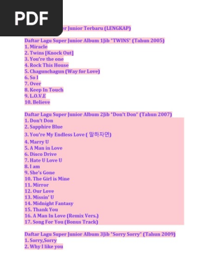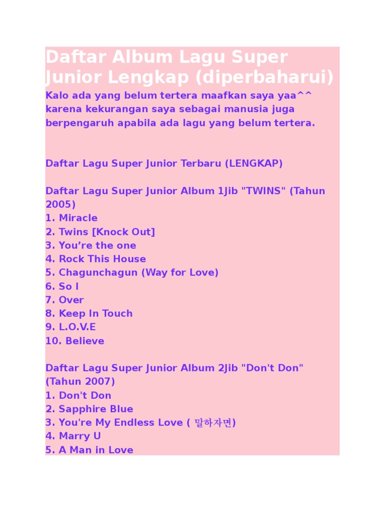 Daftar lagu super junior T. Secara aku suka keduanya Ok ok karena Super Junior lebih panjang daftar lagunya ehm so jangan bosen mantengin ni daftar ampe Zhys World My world Your world Our world Menu. 1st Album Super Junior 05 TWINS 5Desember 2005 1Miracle 2TWINS Knock Out 3You Are The One 4Rock This House 5Way For Love 6So I 7OVER 8Keep In Touch 9LOVE 10TWINS Knock Out Instrumental 2nd Album Miinaelfclouds.