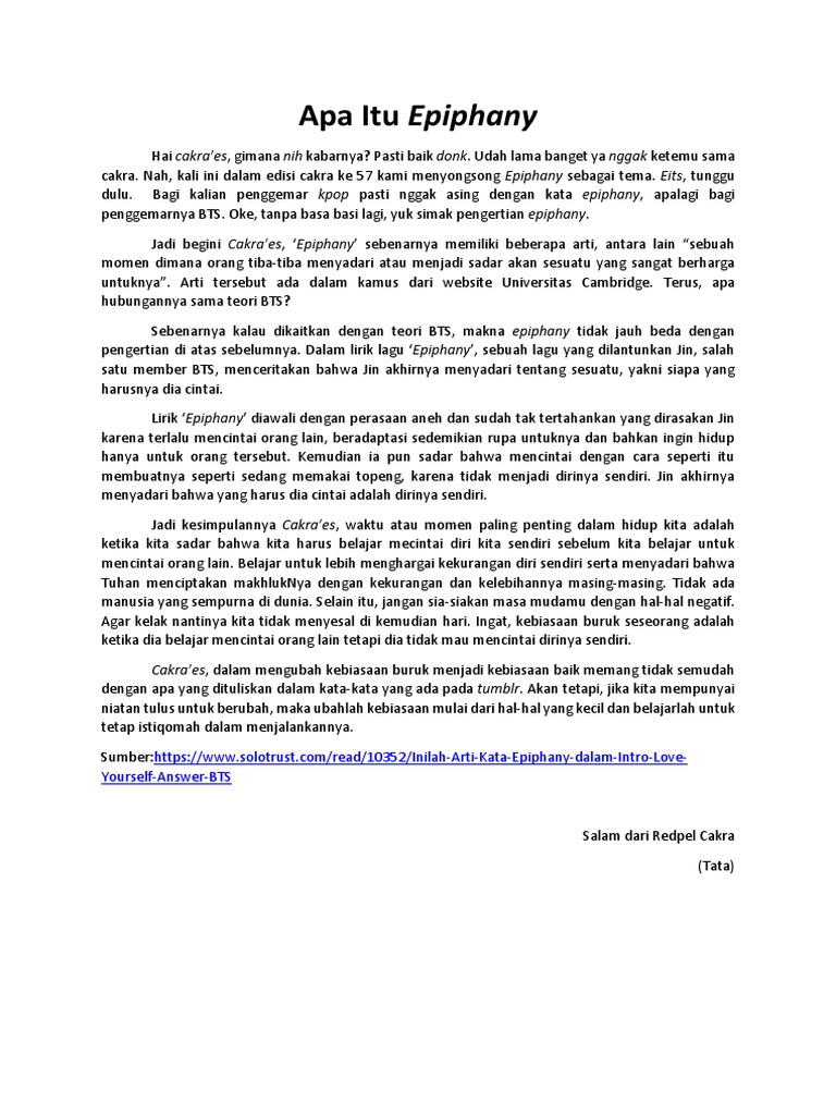 Lirik Lagu BTS Jin Epiphany terjemahan Indonesia. Lagu baru bts di album love yourself. Lirik lagu BTS yang menurut saya mempunyai arti yang dalam dan saya sangat menyukainya saat ini yaitu Epiphany Spring Day Awake BTS Jin - Epiphany Epiphany sendiri mempunyai arti sebuah momen dimana seseorang tiba-tiba menyadari dan sadar akan sesuatu yang berharga untuknya.